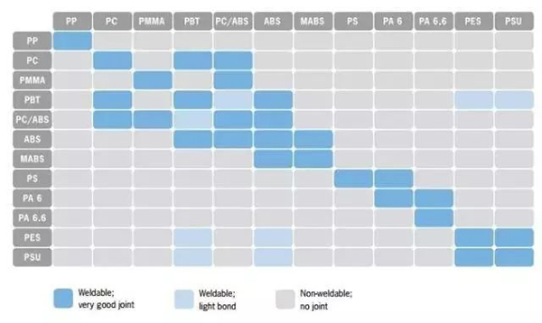 1、激光焊接同樣受到兩種聚合物相容性及熔融溫度差異的影響,兩者相容性越好或熔融溫度越接近,越容易進(jìn)行激光焊接工藝,并獲得更高質(zhì)量的焊接強(qiáng)度。如圖2所示,PC與PBT、ABS與PBT、PC/ABS與PMMA或PC都可以很好地進(jìn)行焊接。